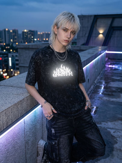 FIREBALL Reflective print, black acid-wash oversized t-shirt